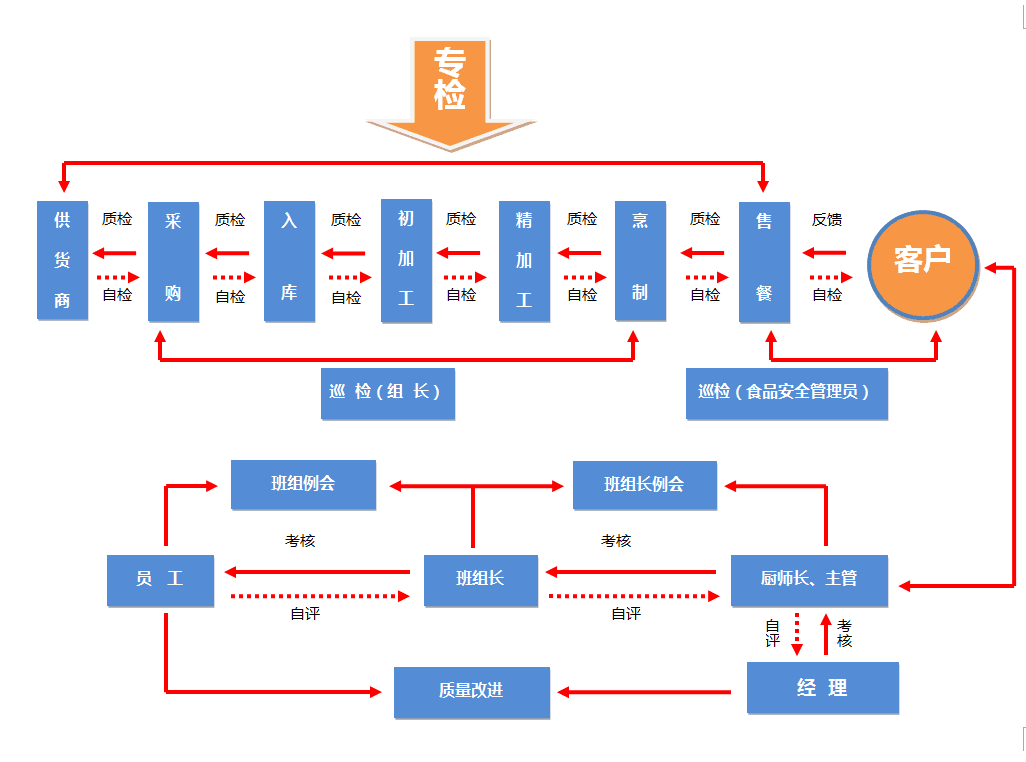 根据公司的品质管理体系及《食堂操作规范》标准、定期对每位员工、每个工种、每道工序及每处加工场所进行评分考核,根据考评结果,对责任人进行奖惩并提出改进意见和整改期限,考